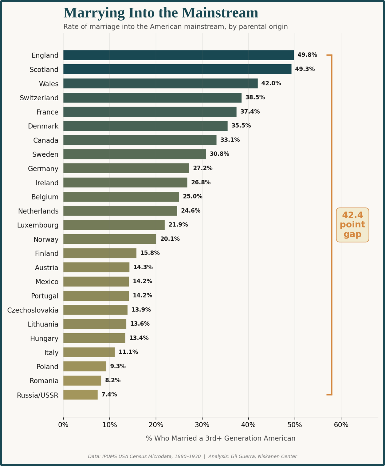 The extremes held fewer surprises. English and Scottish Americans had the highest rates of mainstream marriage, Russian and Polish Americans rounded out the end — but even the familiar endpoints gain new meaning once you see who falls in between.