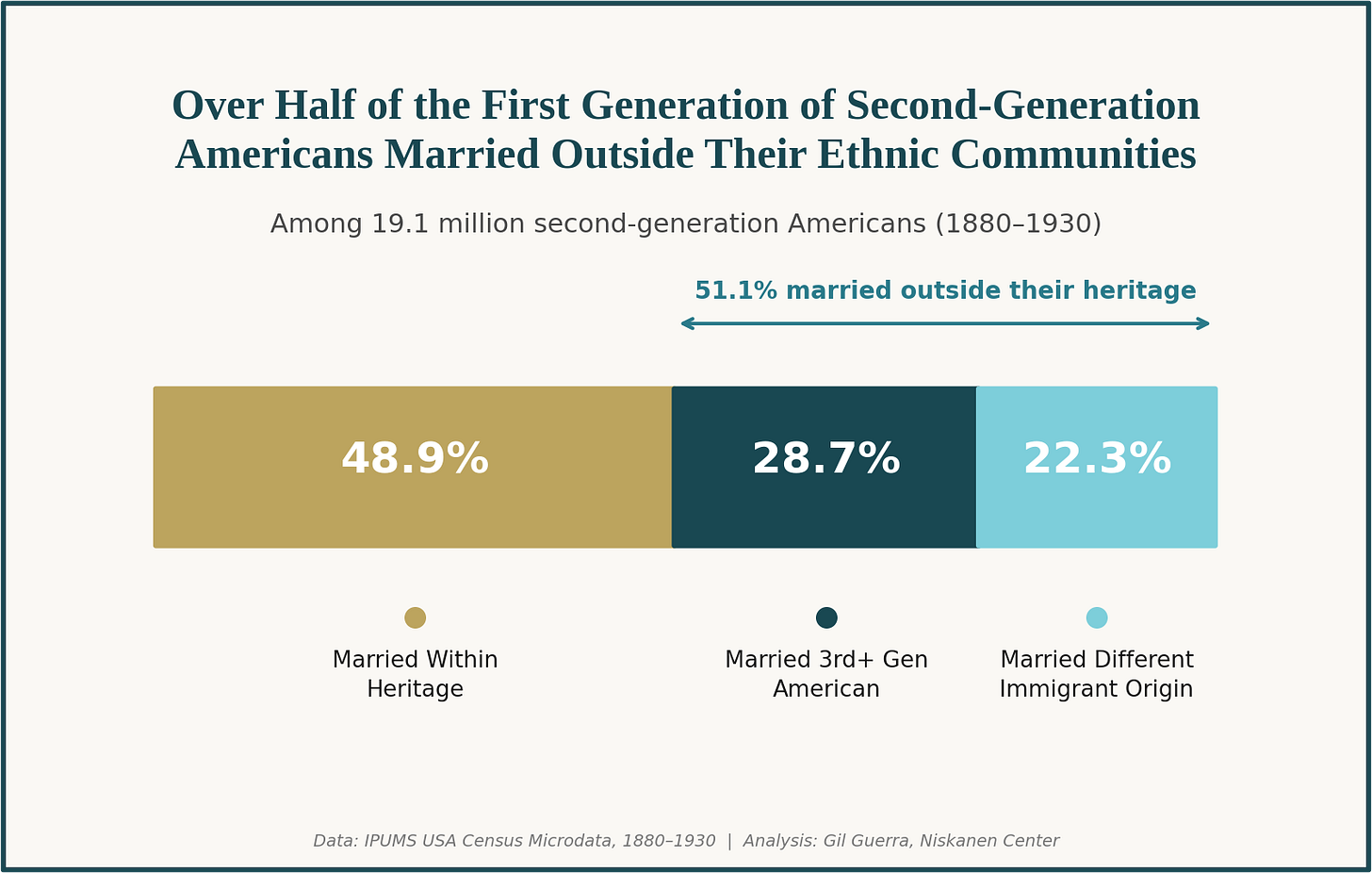 But that majority conceals an important distinction. Of the 51.1 percent who married out, 28.7 percent married a third-generation-or-later American, someone with no traceable recent immigrant ancestry. This is the “mainstream” path, and the version of assimilation that Bill Niskanen’s parents took: an immigrant family arrives, children marry into the broader population, and ethnic identity fades within a generation or two.
