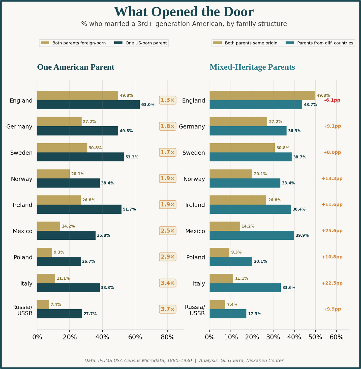 The American-parent effect was enormous — and strongest precisely where integration was hardest. Second-generation Russian Americans with two foreign-born parents married into the mainstream at 7.4 percent. When one parent was U.S.-born, that figure nearly quadrupled to 27.7 percent. The pattern is consistent and striking: having one foot in the door made the second step shorter.