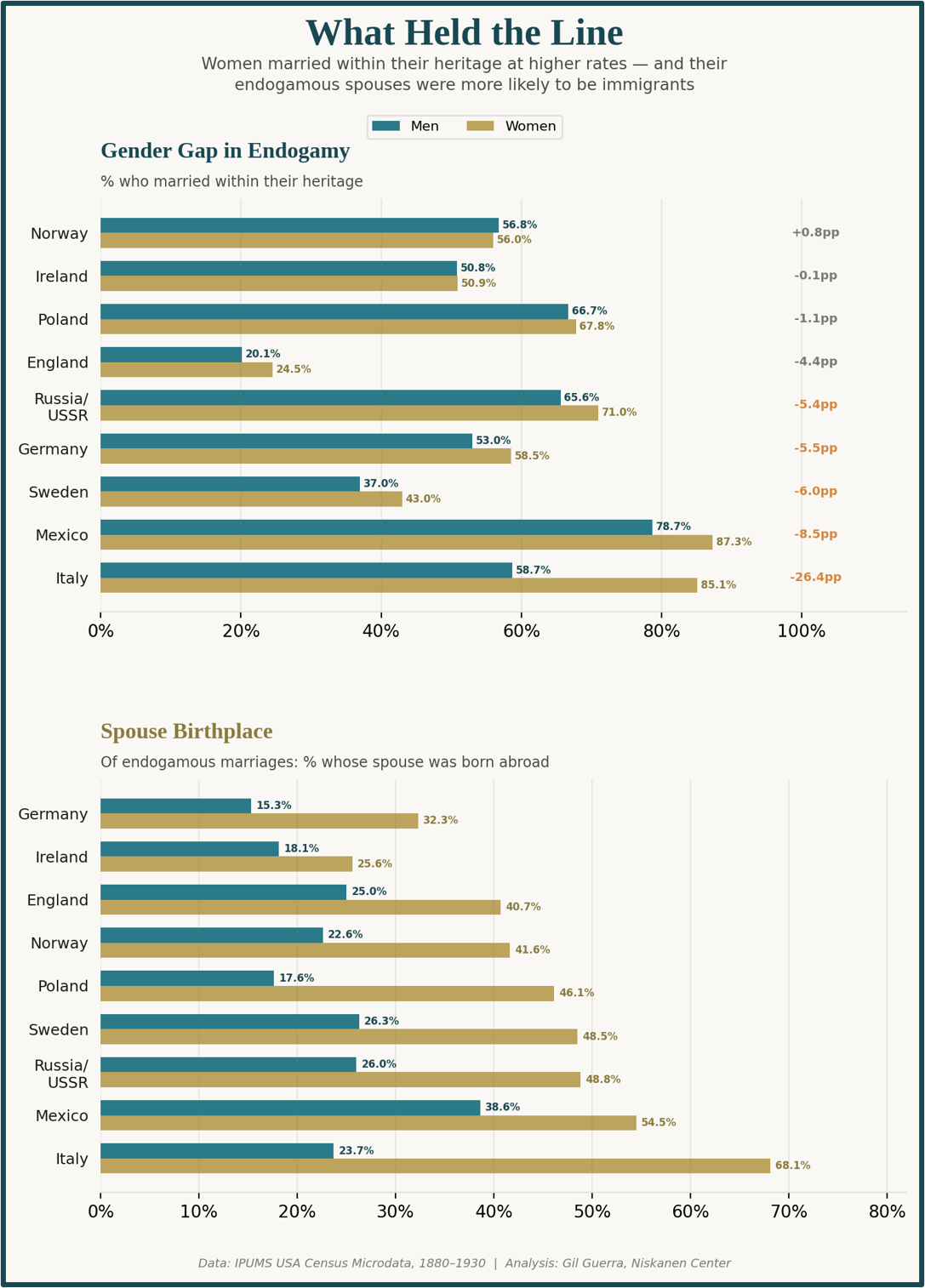 If having an American parent was the strongest accelerator of integration, gender was the strongest brake — and the pattern ran in one direction. In every major group except Norwegian Americans, women married within their heritage community at higher rates than men. For most groups, the gap was modest, running from 2 to 6 percentage points.
