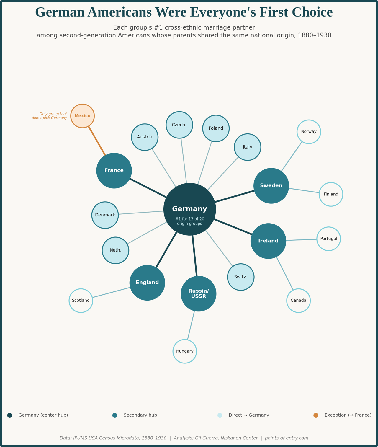 Among the 20 largest second-generation ethnic groups, Mexican Americans were the only group that did not have either Irish or German Americans in their top two most common pairings — an indication of how geographically and socially separate the Mexican American marriage market was from the rest of the country.