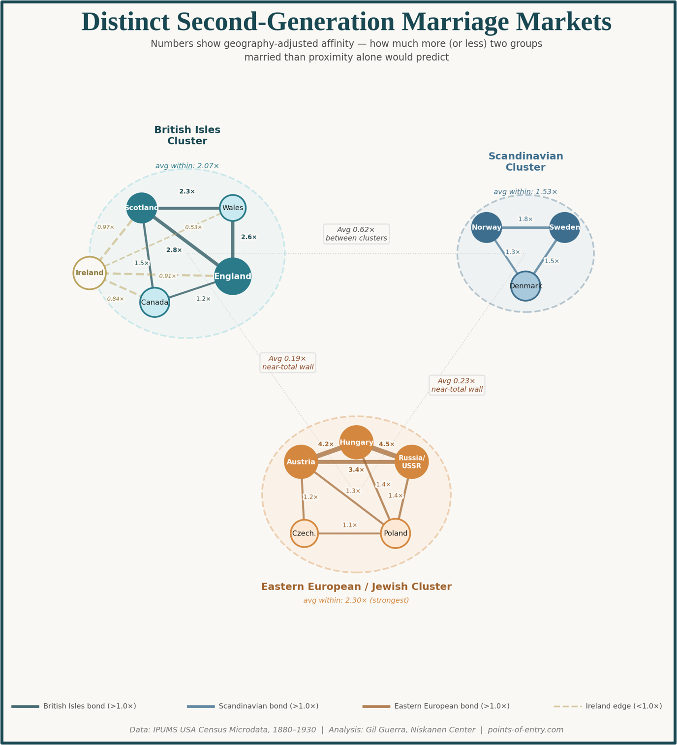 The British Isles cluster is the most intuitive. English, Scottish, and Welsh Americans married each other at two to three times the expected rate: English-Scottish pairings ran at 2.8x, English-Welsh at 2.6x, Scottish-Welsh at 2.3x. Canadians fit comfortably in this group. Irish Americans, meanwhile, were adjacent but not quite inside it — close enough to the door to knock, not quite invited to sit down.