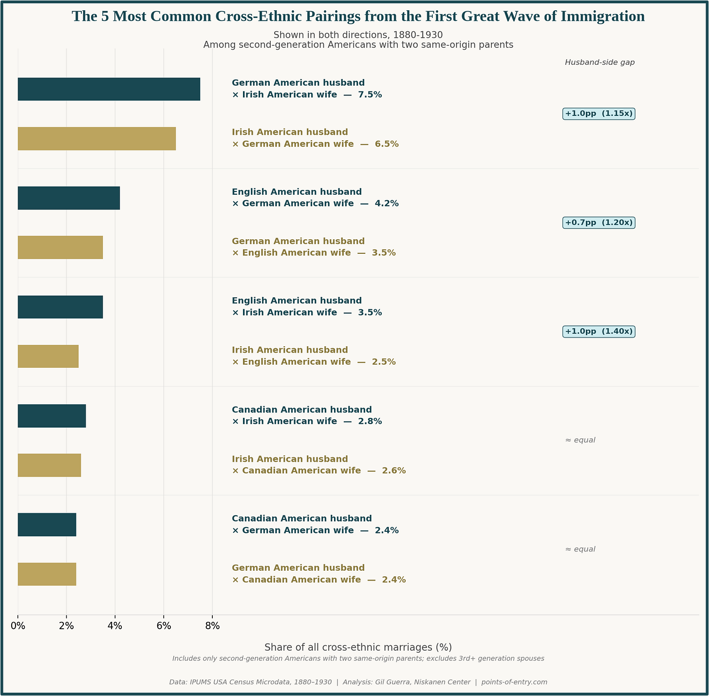 Among second-generation Americans who married into another immigrant community, 35% married an Irish or German American. The most common pairing across all major groups featured a German American husband and an Irish American wife, and the top 10 most common overall pairings all featured either a German or Irish spouse.