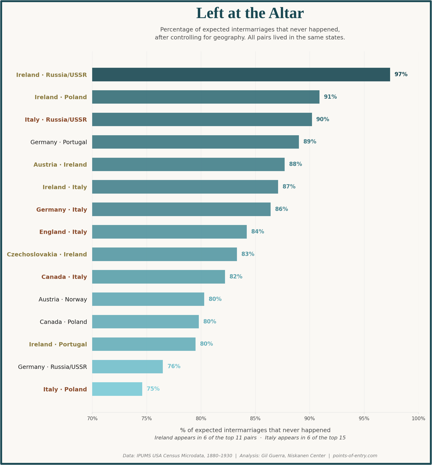 The Irish-Italian American intermarriage rate deserves special attention because it’s the one that, on paper, shouldn’t be so low, and it challenges some previous theories about assimilation. Both groups were Catholic, concentrated in the same northeastern cities, and excluded from being part of the mainstream Protestant “establishment.” They had more in common with each other than most other pairs of groups in this dataset, and yet they married at just 13% of the expected rate — a level of avoidance nearly as severe as the Irish-Jewish divide.
