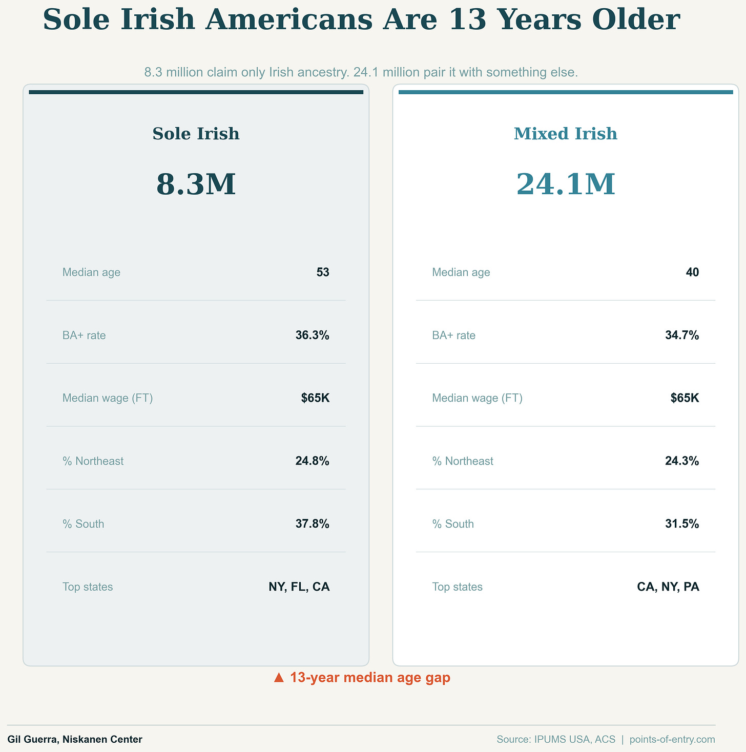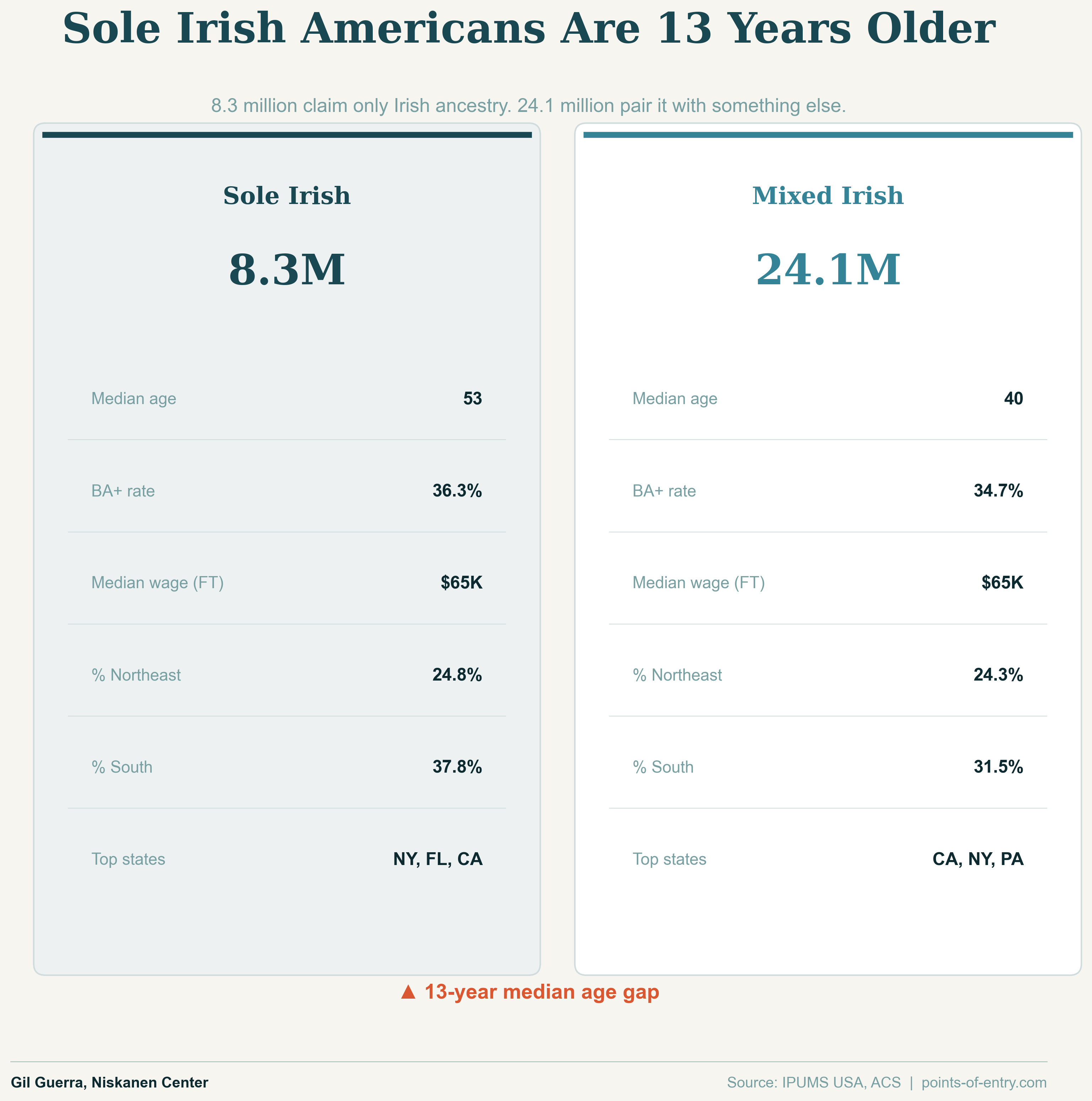 “Sole” Irish Americans are over a decade older on average and have a slightly greater concentration in the South. This population grew slightly from 2019 to 2024, from 8.1 million to 8.3 million.