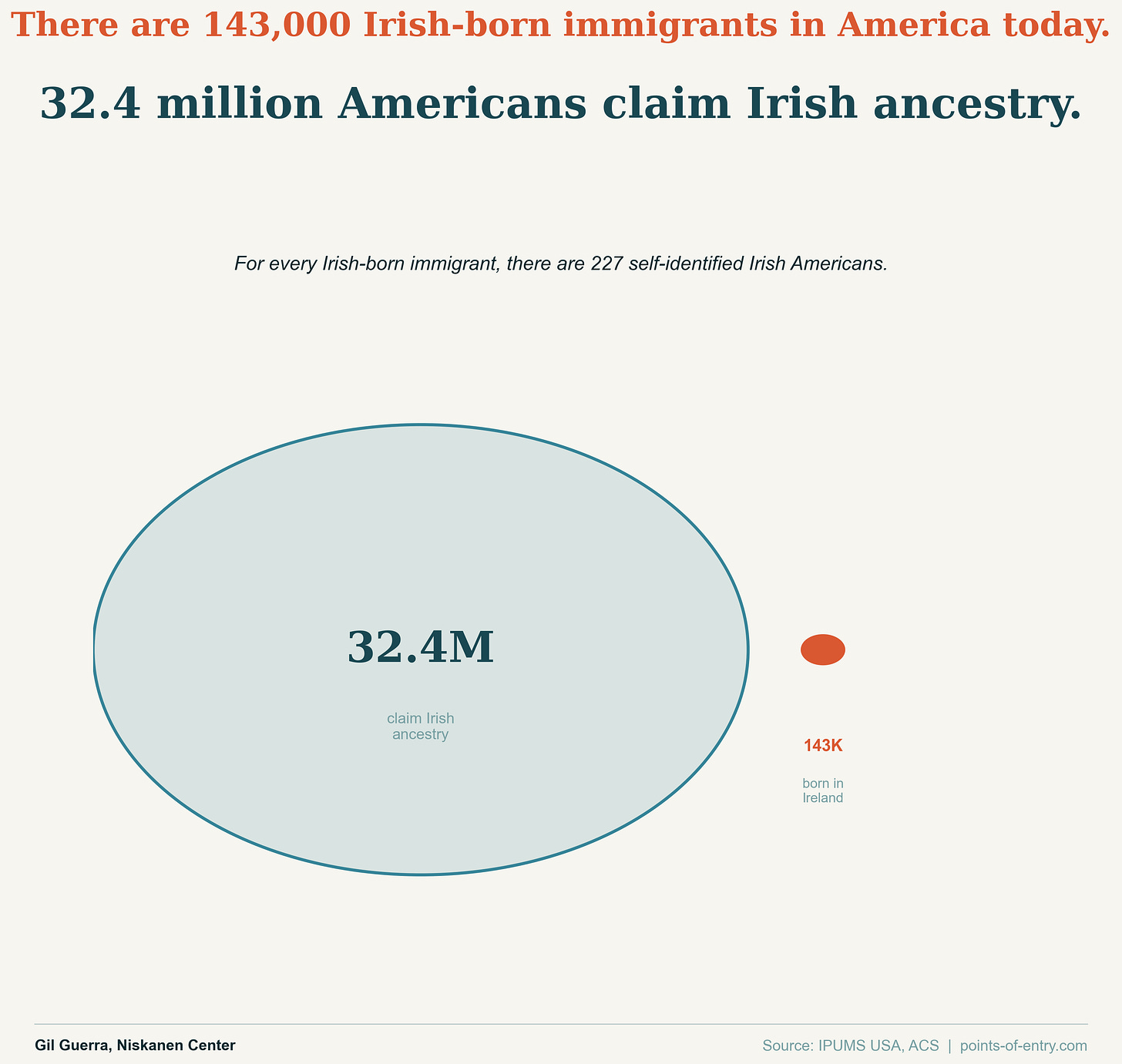In 2024, about 143,000 U.S. residents were born in Ireland. Given that there were 32.4 million Americans who identified themselves as having Irish heritage, this means that there were roughly 227 Irish Americans for every Irish immigrant.