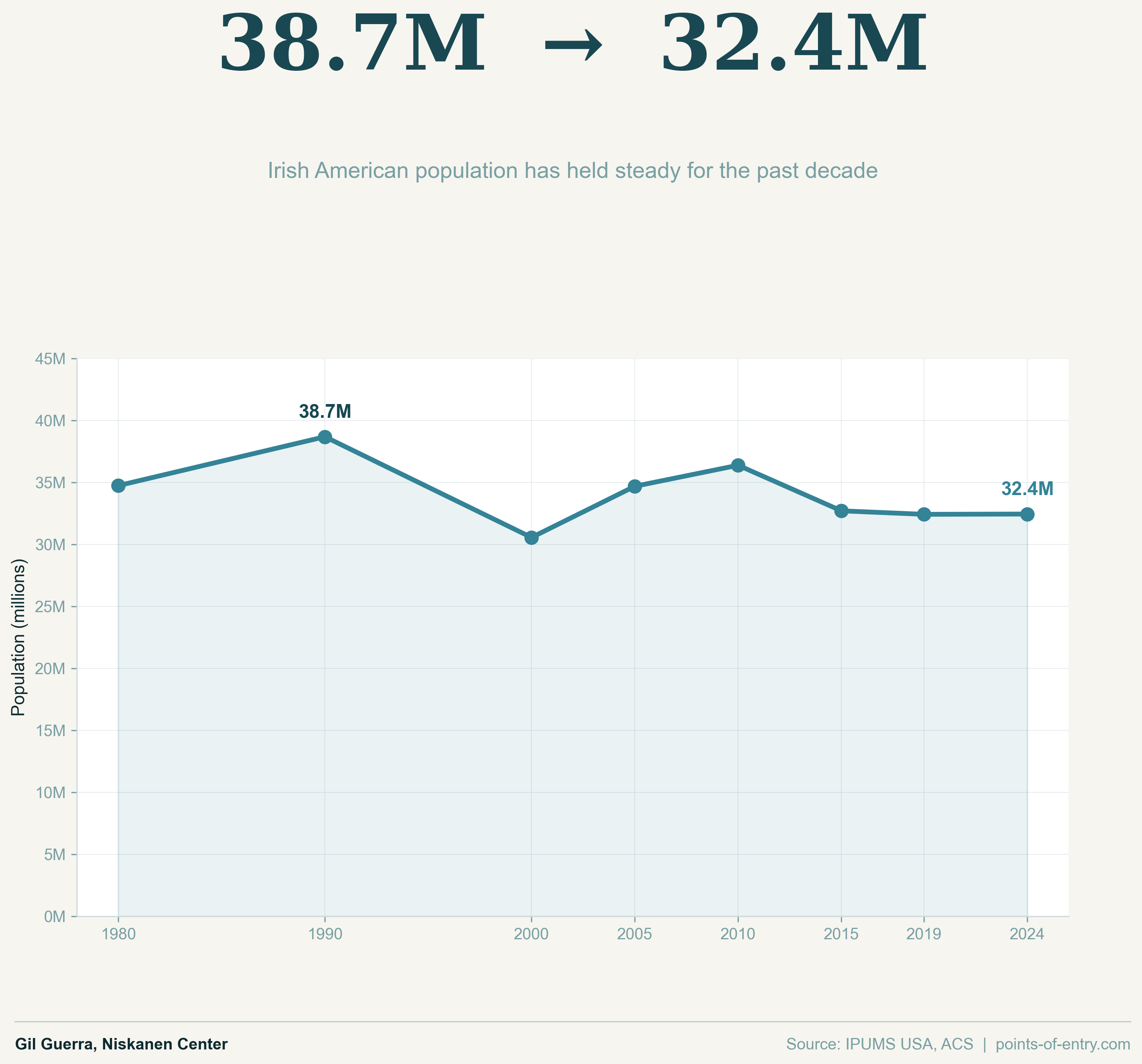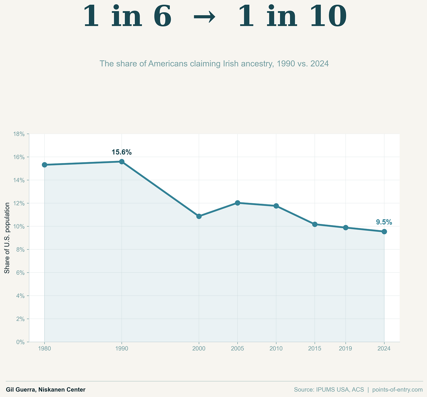 In 1980, 15.3% of the U.S. identified as Irish in some way. As of the latest ACS data release from 2024, that number has gone down to 9.54%.