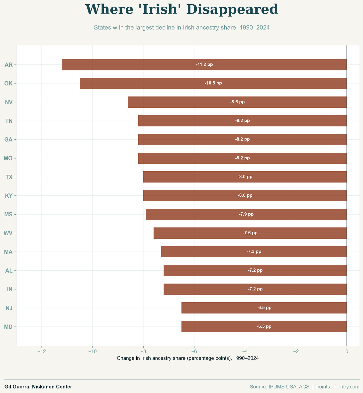 But the states with the greatest rates of decline in Irish identity have almost all been in Appalachia and the South, which have relatively low immigration rates. That indicates a shift among those states’ people of Irish descent, who now have a greater tendency to identify as “Scots-Irish” or just “American.”